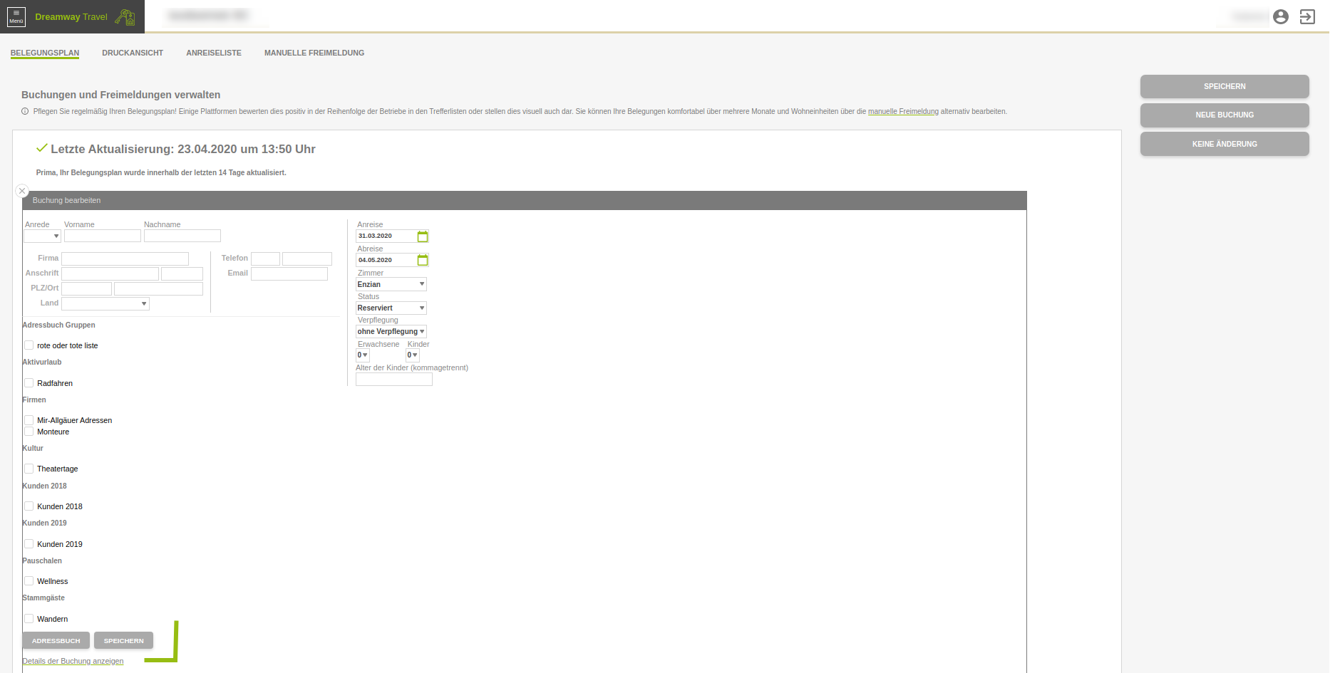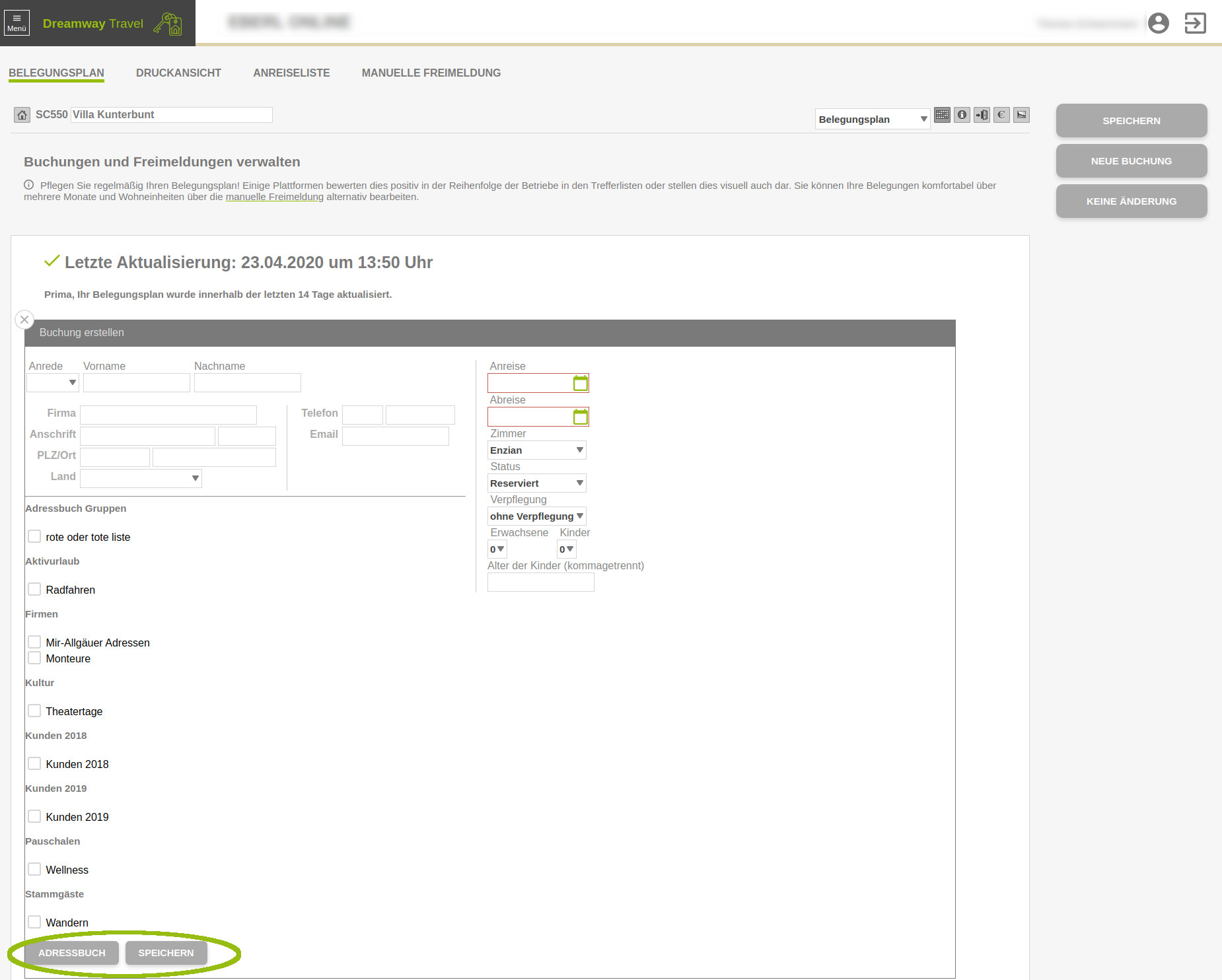 Hier finden Sie den Speicherbutton, aber auch das Feld „Adressbuch“. Unter Adressbuch können Sie Adressdaten in die Buchung laden, welche Sie bereits im Travel Adressbuch hinterlegt haben.