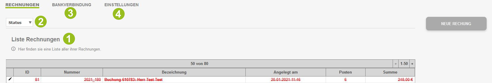 → Schware Rechnungen sind aktive Rechnungen. Rote, durchgestrichene Rechnungen sind stornierte Rechnungen.