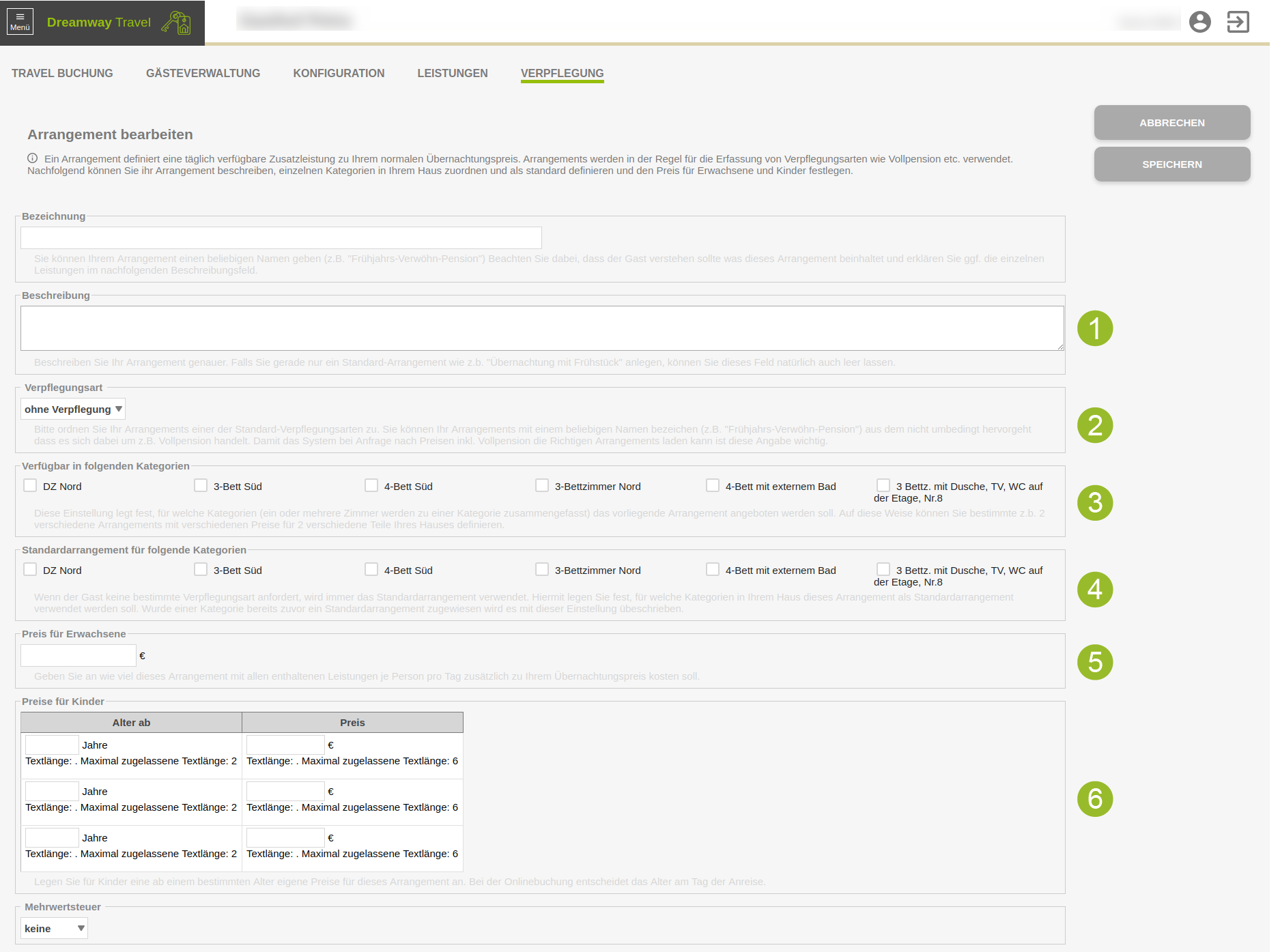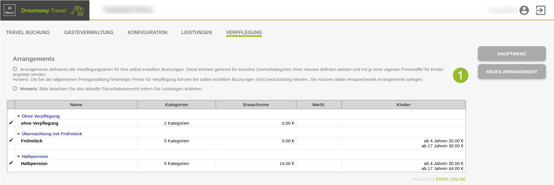 Arrangements definieren die Verpflegungsarten für Ihre selbst erstellten Buchungen. Diese können getrennt für einzelne Zimmerkategorien ihres Hauses definiert werden und mit je einer eigenen Preisstaffel für Kinder angelegt werden.
