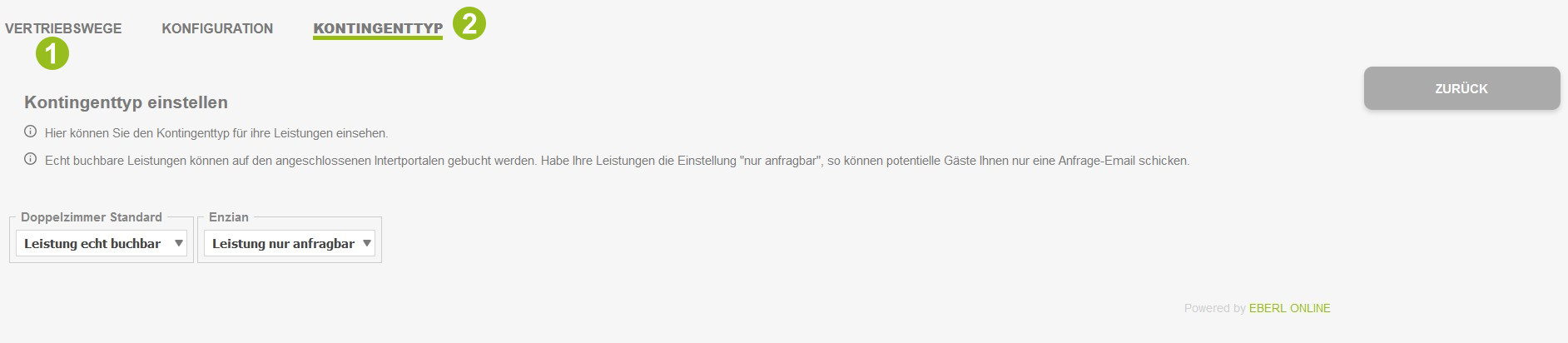 - Gehen Sie auf den Reiter "Kontingenttyp". Hier können Sie sehen, welche Ihrer Wohneinheiten direkt Online Buchbar und welche Anfragbar sind.